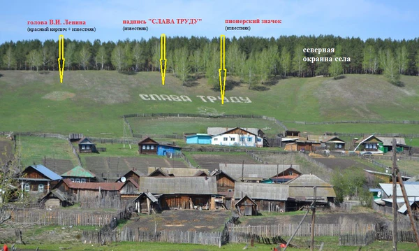 - На северной окраине села в настоящее время (2016 г.) находится геоглиф «СЛАВА ТРУДУ»[54]. Буквы высотой около 10 метров выложены на склоне из известняковых камней и побелены. Геоглиф создан был в 60-е годы XX века и представлял собой барельеф (головы, в профиль) В. И. Ленина, стилизованный контур пионерского значка, цифры двух годов (1917 и текущего года) и надпись «СЛАВА ТРУДУ». Барельеф был выполнен из красного кирпича (изображающие волосы, бороду и тени) и из известняка побеленного. Лицом был обращён на запад, при этом барельеф располагался в проекции продолжения улицы Ленина в селе. Правее (восточнее) барельефа расположены были надписи «СЛАВА ТРУДУ» и под ней по центру стилизованный пионерский значок в виде контура пятилучевой звезды и трех языков пламени, в центре которой цифра показывающая годовщину Октябрьской революции в текущем году. Все фигуры были выложены известняком и побелены. Правее от них так же были выложены цифры годов в 2 яруса, между которыми был выложен серп и молот. Ежегодно жителями села и учениками школы поддерживалось состояние геоглифа, подправлялись скатившиеся по склону камни, обновлялась побелка. После распада СССР элементы геоглифа пришли в упадок, уход остался только за надписью «СЛАВА ТРУДУ». Геоглиф виден как и с земли в зоне прямой видимости, так и на снимках со спутников, к примеру в «Google Maps» (прослеживаются все элементы геоглифа, а не только сохранившиеся в первозданном виде)[55].
