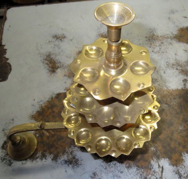 Светильник, в котором горит огонь, изготовлен из металла, — меди, толстой жаростойкой латуни, бронзы или серебра, — и реже из глины[2]. Фитили изготовляются из ваты и окунаются в топлёное масло «гхи». Число фитилей может различаться, однако всегда является нечётным. Вместо масляных фитилей часто используют камфору, кусочек которой горит от нескольких секунд до минут. Светильник принимает различные формы: простая плоская ложка на длинной ручке, чаша или несколько чаш на подставке. Он может также иметь форму цветка лотоса, чакры (для пуджи Сударшане или Муругану) или рыбы (для Вишну), декорироваться фигуркой ваханы (Нанди или Гаруды)[3]. Вместе со светильником на арати предлагаются благовония и цветы. Во время арати в храме звонят в колокол, а дома — колокольчиком. Брахманы дуют в священные раковины шанкхи. Светильник и другие подношения предлагаются как на особом металлическом подносе, называемом «арати-тали», так и без него. Для арати женщины могут одеваться в яркое праздничное сари, которое так и называют: «арати сари»[4].