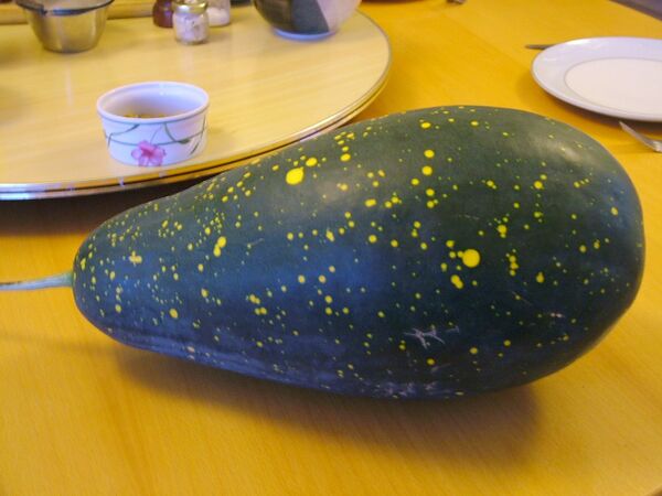 Плод — многосемянная сочная тыквина с гладкой кожурой[7]. В зависимости от сортовых особенностей плоды отличаются: по величине, форме (овальная, шаровидная, цилиндрическая), окраске кожуры (белая, зелёная, жёлтая, с рисунком в виде пятен или полос или однородная); цвету мякоти (малиновая, оранжевая, красная, канареечно-жёлтая, белая, зелёная, лососёвая)[8].