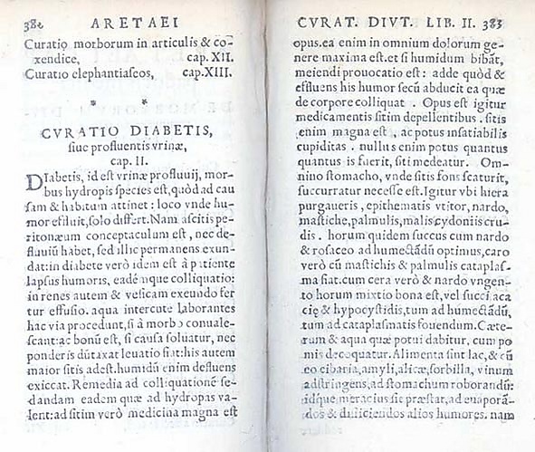 «Диабет — ужасное страдание, не очень частое среди мужчин, растворяющее плоть (то есть, Аретей отмечал у таких пациентов похудение) и конечности (вероятно, о явлении диабетической стопы) в мочу. Пациенты, не переставая, выделяют воду непрерывным потоком, как сквозь открытые водопроводные трубы. Жизнь коротка, неприятна и мучительна, жажда неутолима, прием жидкости чрезмерен и не соразмерен огромному количеству мочи из-за еще большего мочеизнурения. Ничего не может удержать их от приема жидкости и выделения мочи. Если ненадолго они отказываются от приема жидкости, у них пересыхает во рту, кожа и слизистые становятся сухими; у пациентов отмечается тошнота, они возбуждены и в течение короткого промежутка времени погибают»[24][23].