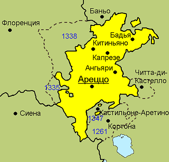 Обострение международного положения Ареццо на рубеже XIII—XIV веков, вызванное усилением экспансии соседних государств и кульминацией борьбы гвельфов и гибеллинов, вызвали рост зависимости республики от наёмных армий кондотьеров и появление тенденции к концентрации государственной власти. Оставаясь в лагере гибеллинов, Ареццо был вынужден для организации отпора гвельфским Флоренции и Сиене прибегать к иностранной помощи. Уже в 1299 году подестой Ареццо стал известный кондотьер Федерико I да Монтефельтро, а в 1308 году правителем государства был избран пизанский тиран Угуччоне делла Фаджиола, который развернул массированное наступление на владения Флорентийской республики. В 1315 году гибеллинская армия Фаджиолы, включающая также и силы Ареццо, разгромила флорентийско-неаполитанские войска в битве при Монтекатини.