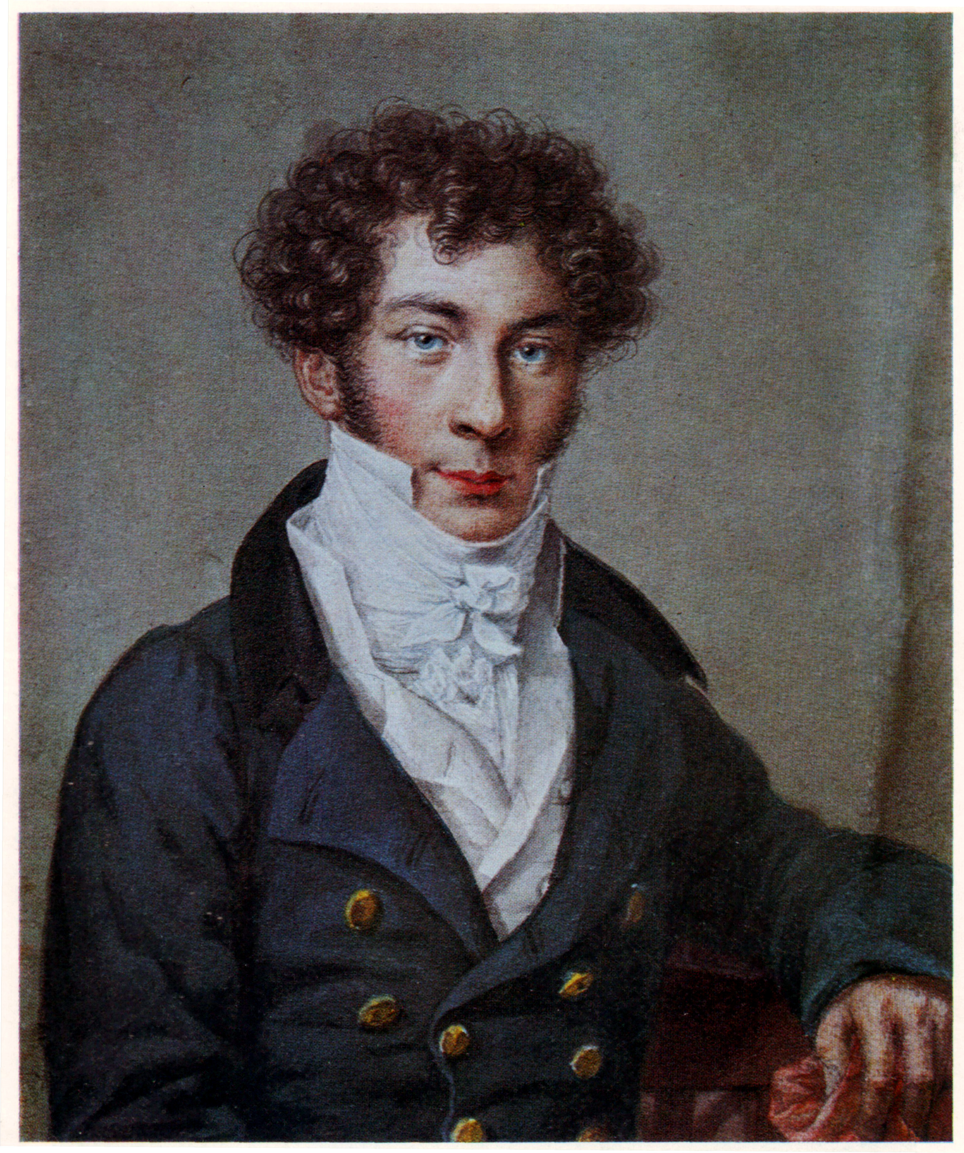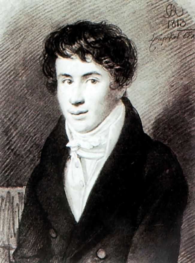 | Константин Николаевич Батюшков (1787—1855). Знаменитый поэт. Его мать страдала психическим расстройством, которое передалось ему по наследству, и беспокойство о своей судьбе всю жизнь преследовало Батюшкова. Участвовал в заграничном походе русской армии 1813—14 годов, дошёл до Парижа. После пребывания за границей вернулся в Петербург, где безответно влюбился в молодую девушку Анну Фурман. В отчаянии он уехал в свой полк, стоявший в Каменец-Подольске, а через год оставил навсегда военную службу, вернулся в Петербург, где вступил в «Арзамас»[38]. | Его звали «Ахиллом», иронизируя над небольшим ростом поэта[37]. Прозвище также отсылало к одноимённой балладе Жуковского[25]. | |