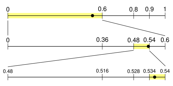 Если необходимо раскодировать сообщение методом арифметического кодирования, закодированное значением 0,538, то в начальном состоянии процесса рассматривается интервал от 0 до 1; на основании известной вероятностной модели дробное значение 0,538 попадает в интервал от 0 до 0,6, что позволяет определить первый символ, который был выбран кодировщиком, поэтому его значение выводится как первый символ декодированного сообщения.