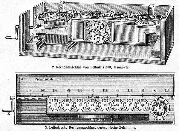 Арифмометр был создан Лейбницем в 1673 году. Сложение чисел выполнялось в десятичной системе счисления при помощи связанных друг с другом колёс, так же как на вычислительной машине другого выдающегося учёного-изобретателя Блеза Паскаля — «Паскалине». Добавленная в конструкцию движущаяся часть и специальная рукоятка, позволявшая крутить ступенчатое колесо Лейбница (в последующих вариантах машины — цилиндры), позволяли ускорить повторяющиеся операции сложения, при помощи которых выполнялось деление и перемножение чисел. Необходимое число повторных сложений выполнялось автоматически.