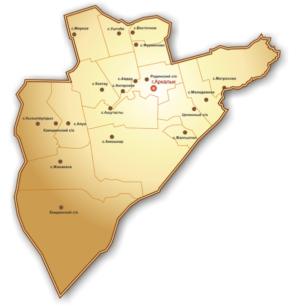 - 14 сёл: Аккошкар, Ангарское, Ашутасты, Восточное, Екидин, Жанакала, Жалгызтал, Коктау, Матросово, Мирное, Молодёжное, Уштобе, Фурманово, Целинное;