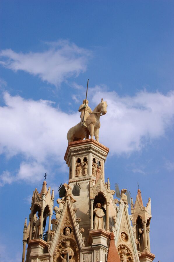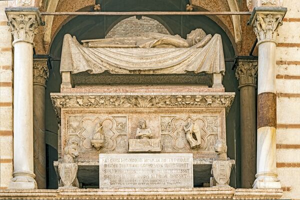 Мастино II делла Скала, скончавшийся в 1351 году, начал строительство надгробия ещё при жизни. Саркофаг украшен фигурами ангелов и святых, сам правитель, одетый в доспехи, изображён на коне.