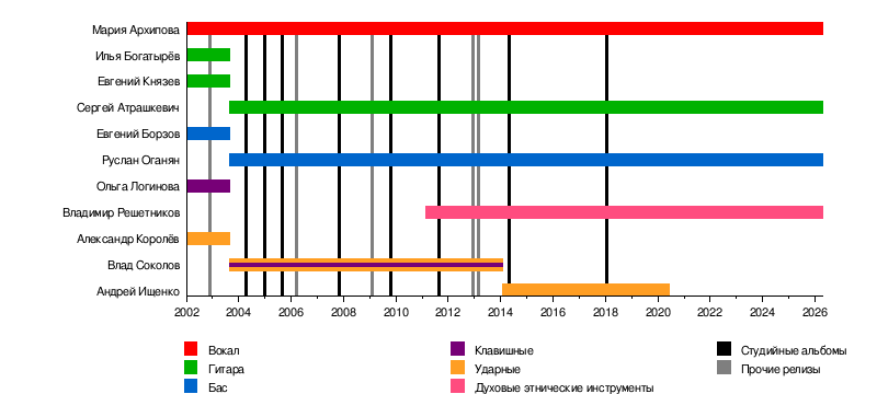 - Мария «Маша Scream» Архипова — вокал, screaming, growling, хоровое пение, горловое пение, тамбурин, шейкер, комуз, бубен, бойран, клавишные (с 2002)