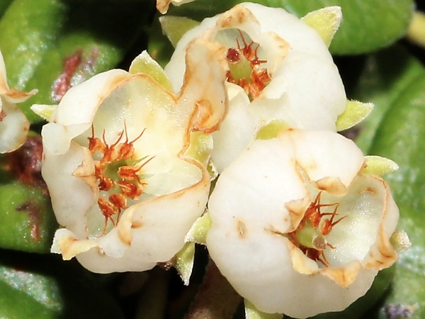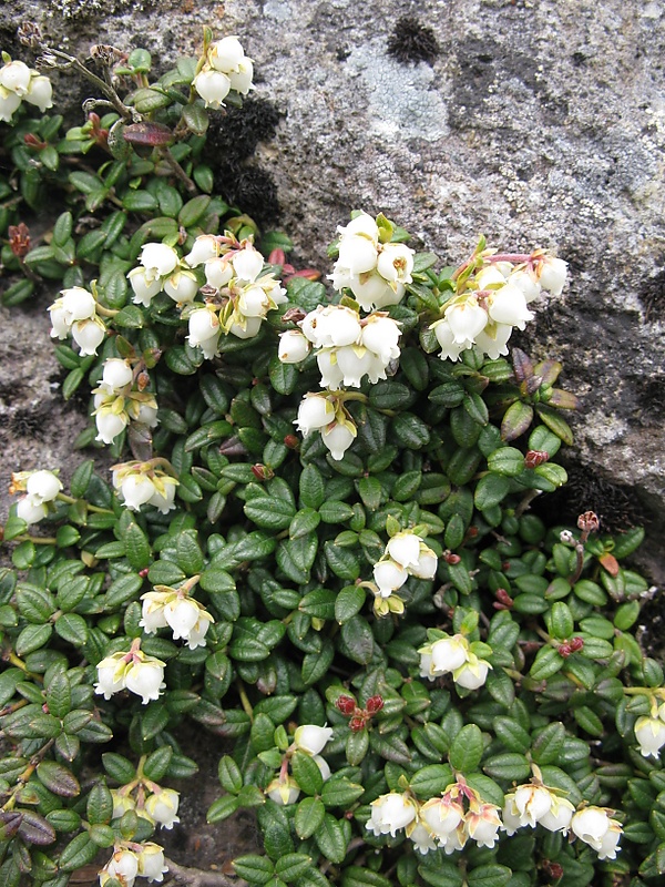 Растительное сообщество вересковых на горе Хакусан (Хонсю, Япония): арктерика низкая с плодами (внизу слева); Кассиопея плауновидная (Cassiope lycopodioides) (вверху справа) — активно цветущее растение с плауновидными побегами; Филлодоце ниппонская (Phyllodoce nipponica) — растение с побегами, похожими на ёлочки |