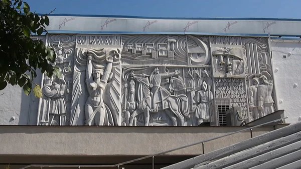 Боковые фасады выполнены барельефными скульптурными композициями (художник-монументалист В. И. Константинов), отражающими путь Казахстана: фигуры Амангельды, Родина-Мать, солдаты, группа космонавтов, женщины, собирающие урожай, сбоку на 2 языках текст: «Велик путь нашего народа, велик его подвиг. Он будет вечным примером для грядущих поколений, для всех, кто избрал дорогу свободы».