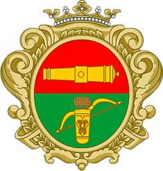 Щит пересечен, в первом, красном поле медная пушка во втором зелёном колчан со стрелами и лук.