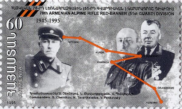 | 76-я стрелковая Краснознамённая дивизия имени тов. Ворошилова[19][30][59][60] | 9 декабря 1941 г. (переформирование 76-й горнострелковой дивизии), Ереван. Позднее переформирована в 51-ю гвардейскую дивизию | 23 ноября 1942 г. (51-я гвардейская стрелковая дивизия) | 1941: Иранская операция