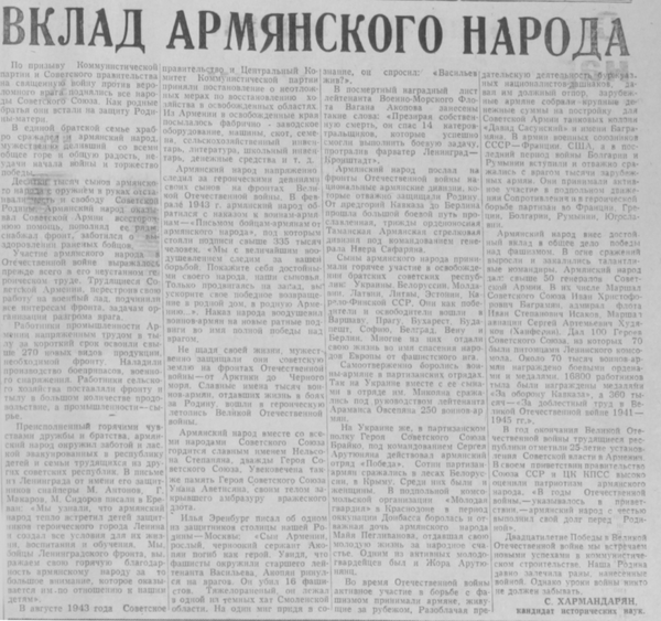 Армянский народ за свою многовековую историю неоднократно подвергался нашествию иноземных захватчиков. Армянский народ твердо занимает свое боевое место в общей борьбе всех народов Советского Союза… Армянский народ, как и все другие свободные и равноправные народы Советского Союза, воспринял нависшую над нашей страной смертельную опасность тем более глубоко, что в своей многовековой истории не раз подвергался нападению чужеземных насильников. Он знает, что такое резня, погромы, голод, насилие. Армянский народ не забыл физические истребления армян, организованные предшественником кровавого Гитлера – кайзером Вильгельмом в годы Первой мировой войны. Поэтому, когда кровавым пожаром вспыхнула война, начатая людоедом Гитлером против Советского Союза, весь армянский народ поднялся, как один, на защиту Родины...