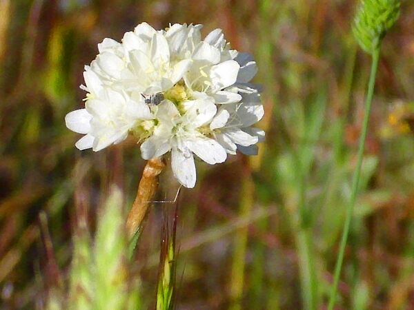 Цветки обоеполые, собраны в головчатое соцветие. Пять чашелистиков срастаются в трубчатую чашечку. Пять лепестков цвета от белого до тёмно-пурпурного срастаются у основания. Пять тычинок располагаются простым кругом.