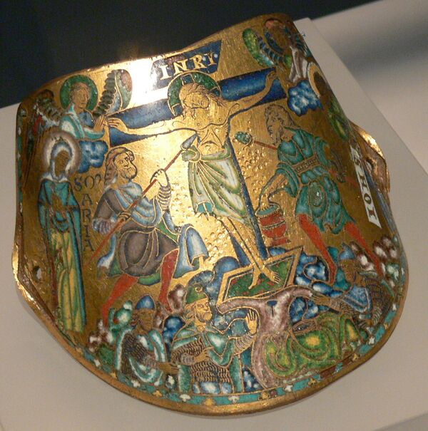 Оставшиеся от Средневековья армиллы исчезающе редки; самая известная пара ныне разделена между Лувром и Германским национальным музеем в Нюрнберге (см. фото), когда-то находившаяся в Эрмитаже. Они были найдены в гробнице великого князя Владимиро-Суздальского Андрея Боголюбского (ум. 1174) во Владимире и, возможно, были дарами императора Фридриха I Барбароссы (годы правления 1152–90), принявшего посольство от великого князя в 1165 году. Это высококачественная работа Маасской школы с выемчатой эмалью на позолоченной меди, изображающая Воскресение Иисуса (Лувр) и Распятие (Нюрнберг). Они, вероятно, надевались на плечо или в противном случае только частично обхватывали конечность и имели отверстия (шесть в примере из Лувра), с помощью которых они предположительно прикреплялись к ремешкам или лентам или пришивались к одежде ниже. Считается, что они были сделаны для ношения самим императором[2].