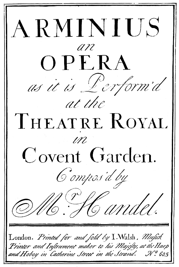 Премьера «Арминия» состоялась 12 января 1737 года в театре Ковент-Гарден. Исполнители: