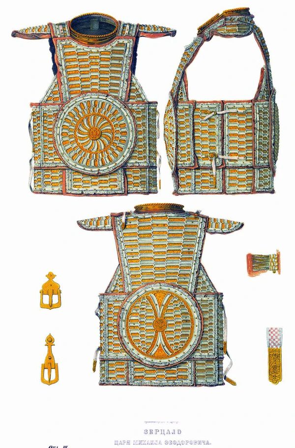 Если основным доспехом русских воинов обычно была кольчуга, то к XIII веку её значительно потесняет пластинчатая система защиты. Во-первых это были ламеллярные доспехи, состоящие из соединённых ремнями пластин. Во-вторых — чешуйчатые, в которых пластины с одного конца укреплялись на кожаной или матерчатой основе. В-третьих — бригантинные, в которых тоже пластины крепились к основе. А в-четвёртых к концу XIII относят появление ранних зерцал, представлявших собой круглую металлическую бляху, одевавшуюся поверх доспеха. В Новгороде и Пскове, например, первые два типа практически полностью вытеснили кольчугу, однако в других русских землях она сохраняла важное значение. Монгольское нашествие принесло распространение некоторых новых типов доспехов. Например, уже в 1252 году войско Даниила Галицкого было, к удивлению немцев, в татарских доспехах: «Беша бо кони в личинах и в коярех кожаных и людье во ярыцех»[18]. С ним же связано и появление куяков — аналогов чешуи или бригантины, бытовавших в Московской Руси, но не получивших большого распространения. Известно, что доспех принимавшего участие в Куликовской битве Дмитрия Донского был пластинчатым, поскольку «был избит и язвен зело», однако идентифицировать его невозможно; по сведению летописи, князь сражался в ряду с простыми воинами. Ко второй половине XV века относятся распространение кольчато-пластинчатых доспехов — бехтерцев и, вероятно, колонтарей, а немногим позднее — юшманов. В XVI—XVII веке кольчуги снова становятся основным доспехом. Причём на Руси кольчугой называли не любой кольчатый доспех, а лишь сделанные из простых колец, скреплённых, как правило, на гвоздь, плетения 1 к 4 или 1 к 6. Отдельно выделяли байданы из широких и плоских колец; и панцири — из мелких плоских колец, именно они были преобладающим типом кольчатого доспеха. С азиатским влиянием связано применение защитной одежды — тегиляев, которые использовались в XVI веке небогатыми людьми, или в сочетании с металлическим доспехом — богатыми. Однако правительство не поддерживало их использование[19]. Богатые люди могли позволить себе зерцало, полностью сделанное из нескольких скреплённых больших металлических пластин. Довольно часто применялись наручи, реже — бутурлыки и наколенники[13][3]. В XVII веке, что связано с организацией полков нового строя к Русско-польской войне, стали использоваться латы, состоящие из кирасы с латной юбкой (полами), и, иногда — ожерелья. Поначалу латы импортировались из Европы, но вскоре же начали изготовляться на тульско-каширских заводах[7]. В описях Оружейной палаты упоминаются и латы московского дела[20].