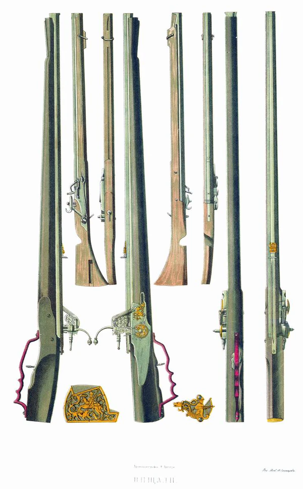 Многоствольные орудия — сороки и органы — использовались и в походах — например, в походе Ермака было 7-ствольное орудие. А Андрей Чохов в 1588 году изготовил «стоствольную пушку». С начала XVII века ручной огнестрел распространяется среди поместной конницы, однако пищали и карабины были, как правило, у боевых холопов, а у дворян и детей боярских — лишь пистолеты. Связано это было с тем, что из ружей из-за тяжести и сложности использования, тогда невозможно было вести стрельбу с лошади, а сражаться в пешем строю дворяне и дети боярские считали для себя унизительным. Поэтому в 1637 году царским указом им было предписано иметь более мощное оружие. До XVII века использовались фитильные замки. Хотя в XVI веке появились пистолеты, ружья и даже затинные пищали, снабжённые колесцовыми замками, однако эти замки импортировались и не получили распространения нигде, кроме как на пистолетах дворянской конницы. Со второй половины XVI века известен ударно-кремнёвый замок, получивший широкое распространение в XVII. В России применялись как оружие собственного производства, так и импорт — право выбора зависело от состояния конкретного бойца. Причём в России производили все основные типы огнестрельного оружия, включая карабины и пистолеты. В середине XVII века также отмечено собственное производство нарезных пищалей[7].