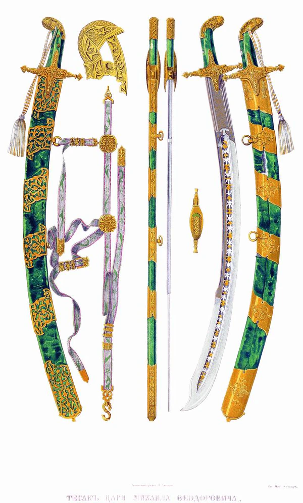 Мечи на Руси довольно быстро были вытеснены саблями, однако в северных регионах применялись дольше. Они импортировались из Европы и были весьма разнообразны, вплоть до двуручных. В Московском Царстве мечи практически не применялись, хотя в Оружейной палате есть некоторые немецкие и русские образцы, например, фламберги, но их боевое значение исключено. Основным же клинковым оружием по крайней мере с XV века была сабля. Сабли применялись очень разнообразные, как отечественные, так и импортированные из стран Западной Азии или Восточной Европы. Их форма тоже была различной, но, в основном, персидского или турецкого типа. Также они ковались на Черкаское, Угорское, Литовское, Немецкое «дело» и т. д., иногда их комбинировали. Ценились сабли, сделанные из булата, а также из дамаска, но они были не каждому по средствам — полоса персидской булатной стали стоила 3—4 рубля, в то время как тульская сабля из передельной стали в середине XVII века — не дороже 60 копеек. В описях, в частности упоминаются, кроме стальных, сабли из красного булата, красного железа, «полосы булат синей Московский выков». С XIV века использовались удобные для прокалывания вражеских доспехов кончары, а в XVII — палаши, но все они встречались довольно редко. С формированием полков нового строя на вооружении появляются шпаги и начинается их производство[7][13].