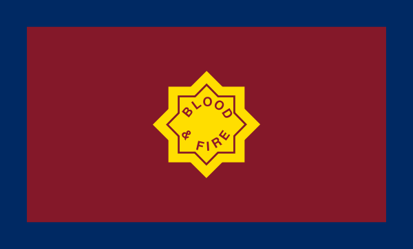 Символика крови Христа и огня Святого Духа была положена в основу флага Армии спасения. Солдаты Армии спасения восприняли себя в качестве «солдат Иисуса Христа»[5], которые ведут войну против греха и социальных зол. Флаг Армии спасения стал символом этой войны. Он представляет собой тёмно-красное (малиновое) полотно с синим обрамлением и восьмиконечной жёлтой звездой со словами «Кровь и огонь» в центре. Тёмно-красный фон флага символизирует пролитие крови Иисуса Христа, жёлтый цвет звезды — огонь Святого Духа, а синее обрамление флага — чистоту и святость Бога Отца. Флаг был разработан Екатериной Бут в 1878 году и подарен корпусу Ковентри. В первоначальной версии в центре было изображено жёлтое солнце. Оно было изменено на звезду в 1882 году[10]:102, когда представители Армии спасения отправились в Индию и опасались оскорбить народ Парсов, для которых солнце является священным символом[9]:174-175.
