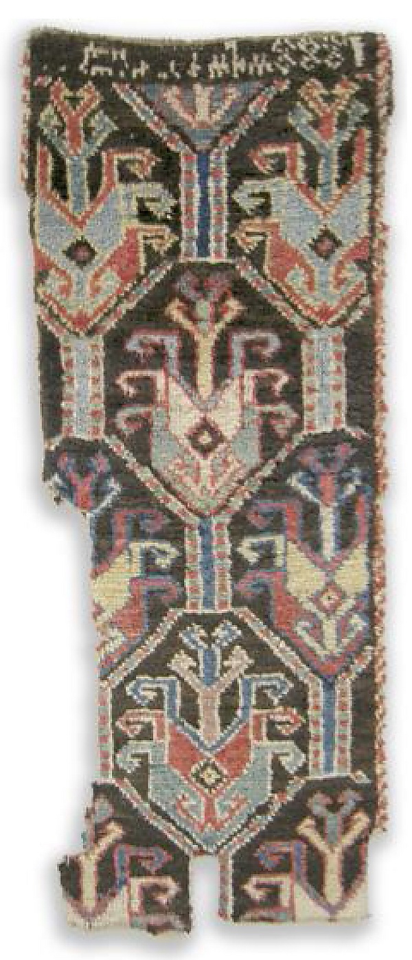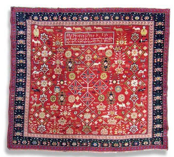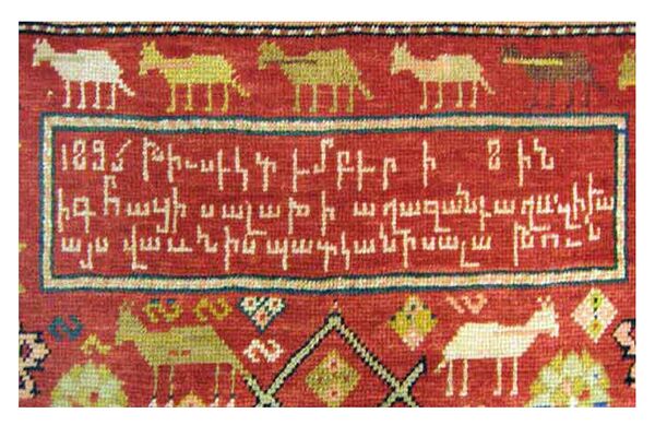 По мнению профессора арменоведения из Национального института восточных языков и цивилизаций (INALCO), Париж, Франция, Тиграна Куймджяна[140], включение тканных надписей в поле или обрамление ковров объясняется армянской традицией, которая существует почти во всех видах армянского прикладного искусства. Различного содержания надписи (посвящения или колофоны) можно увидеть на миниатюрах в раннесредневековых армянских манускриптах, на окладах рукописей, на изделиях из дерева или металла, на керамических или текстильных изделиях. Этой традиции особенно строго придерживались армяне, в отличие от других народов Востока[141].
