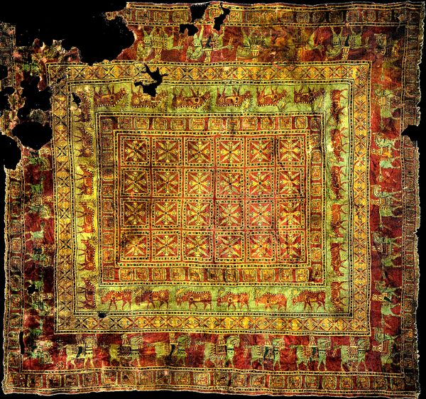 Античный историк V века до н. э. Геродот (485—425 гг. до н. э.) отмечает, что жители Кавказа растениями, из которых получали краску, красили шерсть, затем вырабатывали из неё ткани, разрисовывали их, и окраска их не блёкнет ни от времени, ни от воды[34]. В 1949 году академиком Руденко во время археологических раскопок, проводимых в Горном Алтае, в 5-м пазырыкском кургане был найден ковёр V века до нашей эры[41]. Вопросом дебатов является происхождение ковра в Средней или Передней Азии, но в особенности Армения упоминается как возможное место происхождение ковра[42][43][44][45]. Некоторые исследователи считают, что ковёр относится к раннеармянским[40][46][47][48].