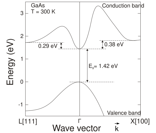 - Ширина запрещённой зоны при 300 K — 1.424 эВ