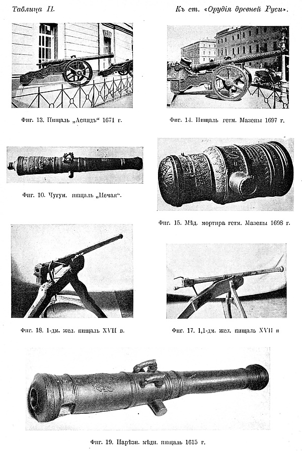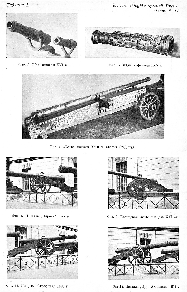 В России появление огнестрельных орудий восходит к концу XIV столетия. Согласно летописям, кованые пушки — «тюфяки» (от перс. тупанг) — были впервые использованы 1382 году в княжение Дмитрия Донского, при осаде Москвы войском татарского хана Тохтамыша. В 1389 году на Русь привезены были из-за границы, по-видимому, первые кованые орудия — «арматы и стрельба огненная».