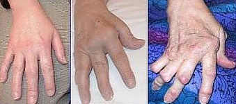 Одним из главных проявлений ревматоидного артрита являются боль и отёк в различных суставах, особенно в суставах пальцев рук. Характерно симметричное поражение мелких суставов рук и стоп. Боли усиливаются при движении и в состоянии покоя, появляется утренняя скованность, отёчность и нарушение функции суставов. С течением времени могут вовлекаться суставы стоп, голеностопные, коленные, локтевые. У некоторых пациентов поражение начинается с суставов ног (коленных, голеностопных), плечевых суставов, а затем распространяется на руки. Хроническое воспаление суставов приводит к разрушению суставной хрящевой ткани и возникновению деформации суставов, что, в свою очередь, вызывает болевые ощущения при движении и ограничение подвижности.