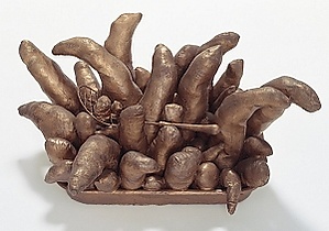 Чтобы добиться признания, многие художницы пытались устранить гендерные признаки из своих работ, чтобы не выделяться в преимущественно мужском мире искусства. Если работа не выглядит как женская, предубеждения в отношении женщин не будут оказывать влияние на её восприятие, таким образом выдвигая на первый план её собственную ценность. В 1963 году Яёи Кусама создала скульптуру Oven-Pan — часть большой серии работ, которую она назвала «агрегационными скульптурами» (англ. aggregation sculptures). Работы из этой серии представляют собой предмет, связанный с женским занятием — в случае Oven-Pan это металлический противень — и полностью заполняет его выпуклыми комками из того же материала. Это ранний феминистский пример того, как художницы находят способ разрушить традиционное восприятие роли женщин в обществе. Наличие комков, сделанных из того же цвета и материала, что и металлический противень, полностью лишает противень функциональности и, в метафорическом смысле, связь с женщинами. Одновременно устраняется гендерный признак предмета, что не только лишает его функции кухонной принадлежности, которую используют женщины, но и превращает в нечто уродливое. В предыдущий период женские произведения представляли собой красивые и декоративные предметы, таких как пейзажи и лоскутные одеяла, тогда как более современные произведения женского искусства стали смелыми или даже мятежными.