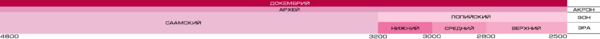 В российской стратиграфической шкале архей тоже присутствует, но является не эоном, а акроном — более высоким делением (таким же делением является ещё и протерозой). Архей поделён на два эона: нижнеархейский или саамский (от формирования Земли до 3,2 млрд лет назад) и верхнеархейский или лопийский (от 3,2 до 2,5 млрд лет назад). Лопийский эон подразделяется на три эры (в скобках длительность в млрд лет): нижнелопийская (3,2-3,0), среднелопийская (3,0-2,8) и верхнелопийская (2,8-2,5)[14].