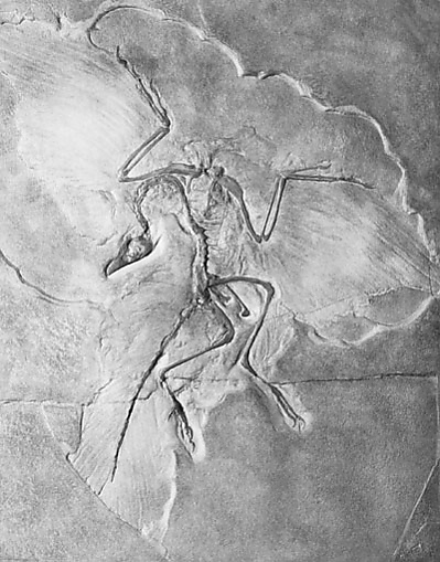 Лондонский экземпляр археоптерикса был обнаружен в 1861 году, два года спустя после опубликования «Происхождения видов» Чарльза Дарвина. Реконструкция анатомии археоптерикса, основанная на лондонском экземпляре, показала, что по строению скелета он занимает промежуточное положение между рептилиями и птицами. В «Происхождении видов» Дарвин отмечал, что, согласно его теории, такие формы должны были существовать, и указывал на их отсутствие как на серьёзное возражение против теории. В связи с этим открытие археоптерикса привлекло внимание единомышленников Дарвина (в первую очередь Томаса Генри Хаксли). Сам Дарвин в переизданиях «Происхождения видов» кратко упоминал археоптерикса в десятой главе, посвящённой неполноте палеонтологической летописи (см. например, издание 1866 года[26].). В итоге археоптерикс и его анатомия стали предметом дискуссий между сторонниками эволюционного учения и их оппонентами. Открытие археоптерикса на заре становления эволюционной биологии и реконструкция его скелета сделали археоптерикса хрестоматийным примером существа, анатомия которого позволяет проследить происхождение одного таксона от другого. На сегодняшний день археоптерикс является одним из наиболее известных за пределами научного сообщества вымерших животных.