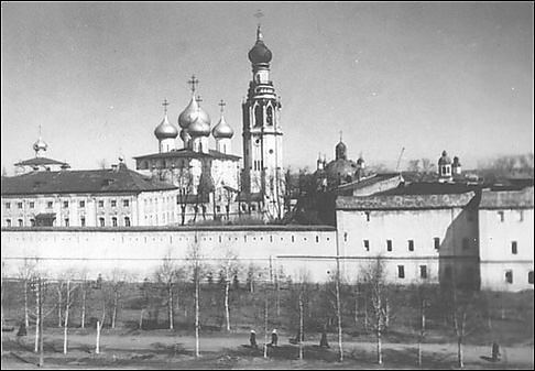 Да на архиепископли-ж дворе келья архиепископля с комнатою на подклете, да келья казенная на подклете-ж, а промеж ими повалуша, да двои сени, да келья задняя на подклете с сенми-ж, да у задних ворот изба судная, да против избы клеть, а промеж ими сени да келья на подклети с сенми подьяческая, да четыре житницы, да два погреба, да ледник, а над погребами сушила рубленныя да хлебня, да поварня, да конюшня, а на верху сенницы, да на архиепископли-ж дворе середи двора прудец не велик, копаной, а в нем сажена рыба караси, да ворота задние, а у ворот изба воротная с сенми, а около двора забор в длину двора от ворот семьдесят сажен, поперег шестьдесят сажен.