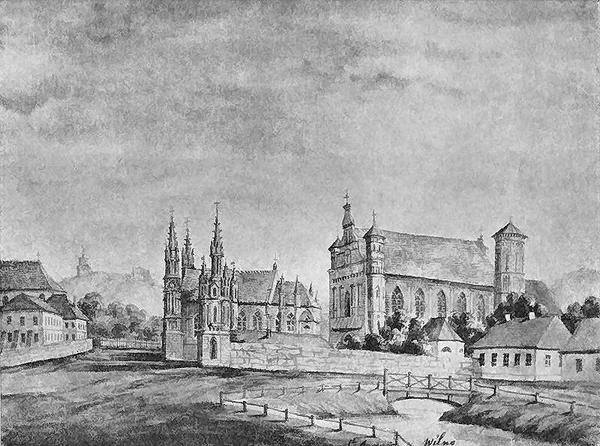 При переходе великокняжеской династии и некоторых магнатских родов в католичество в Великом княжестве Литовском после Кревской унии начинают строиться первые костёлы уже не только для замкнутых торговых колоний, но и для местных жителей-католиков. Эти новые костёлы обогащают прежнюю замковую готику княжества готикой костёльной[75]. Первыми такими костёлами готического стиля были: костёл св. Николая (1387) в Вильно, виленская кафедра (в своём первом виде), сооружённая в 1407 году[76], францисканский костёл в Вильно (1430). Далее построены два бернардинских монастыря: деревянный виленский с костёлом св. Франциска (1469) и деревянный монастырь с костёлом во имя св. Георгия (1471) в Ковно.