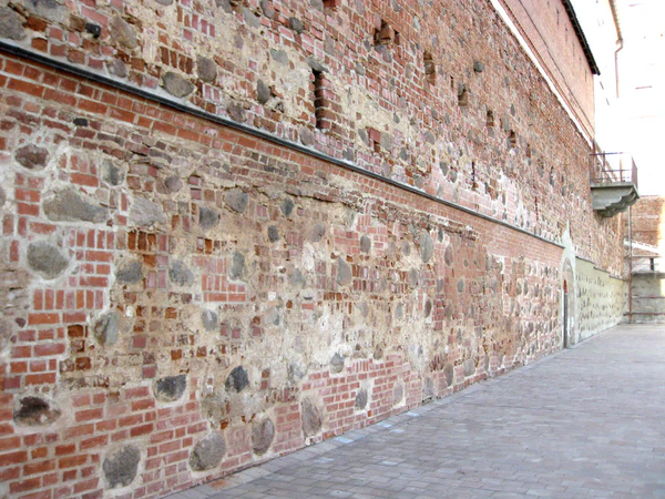 Основными строительными материалами замков служили дерево, кирпич и камень. Кирпич, применявшийся для строительства монастырей и замков, имел форму тонких и сравнительно широких плиток. В письменных источниках того времени он называется греческим словом «плинфа» (плинт, плинф). Глину разминали в большой яме, затем ею заполняли деревянную форму. Потом этот сырец складывали в штабеля и сушили две недели, после чего обжигали в специальных печах. Позже наряду с плинфой начали делать и брусковый кирпич, уже распространившийся в Европе[39].