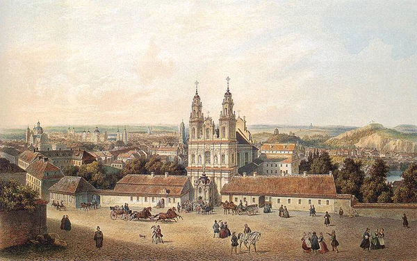 В 1579 году королём польским и великим князем литовским Стефаном Баторием по ходатайству ордена иезуитов и папы римского Григория XIII основано первое высшее учебное заведение в Великом княжестве Литовском — Академия и университет виленский (Almae Academia et Universitas Vilnensis Societatis Jes). Ансамбль Виленского университета, вобравший в себя за четыре века самые разные архитектурные стили, в настоящее время занимает чуть ли не весь квартал старого города. Начав формироваться около 1570 года, он, благодаря иезуитскому ордену, обрастал новыми домами и дворами и ныне состоит из 13 дворов (двор библиотеки, двор обсерватории, двор бурсы и др.) с 12 соединяющимися зданиями, костёлом святых Иоаннов и колокольней[50].