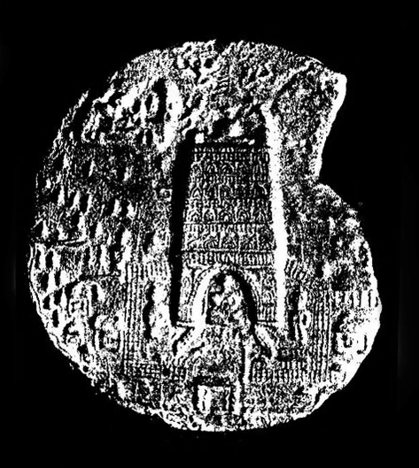 Фрагмент арки, обнаруженный археологом К. П. Джаясвалом, с надписью на языке брахми[43][44],датируется I—II веком н. э., когда она впервые появилась в архитектуре дворца Каусамби периода Кушана[45].
