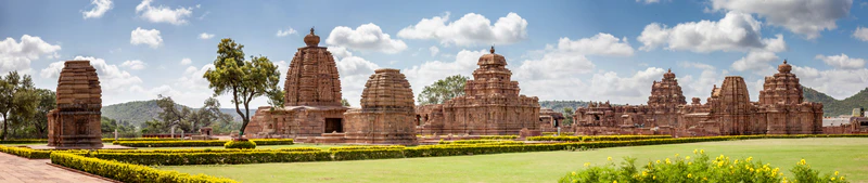 Вид на главную группу в Паттадакале — комплексе индуистских и джайнских храмов VII и VIII веков н. э. на севере штата Карнатака