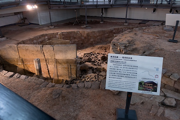 В 1997 году в центре Гуанчжоу был обнаружен Каменный ручей Кривого Камня (кит. 曲流石渠) периода царства Наньюэ. Этот каменный водный путь первоначально простирался на 180 метров, из которых сохранилось 160 метров. Он извивается с северо-востока на юго-запад и включает искусственные гидравлические сооружения, такие как резкий изгиб, пруд в форме полумесяца, спуски, мосты и пошаговые камни[4]. Искусство ландшафта воплощает в себе сложную инженерию садов циньско-ханьской эпохи с их многофункциональной архитектурой. Он представляет собой самый ранний и лучше всего сохранившийся образец императорских садов эпохи Цинь-Хань, найденный на сегодняшний день[5]. Сейчас это место Дворца и Сада, часть Музея царя Наньюэ.