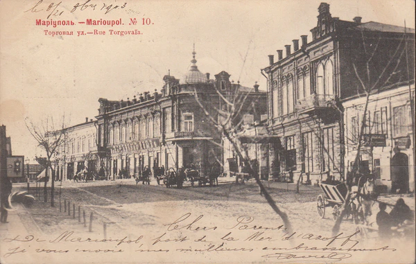 Большинство зданий старого центра Мариуполя, построенных до Октябрьской революции, выполнены в стиле русского классицизма; в начале века — по типовым проектам, в которые по желанию заказчика вносились небольшие изменения, в конце в городе стали появляться многоэтажные здания, имевшие индивидуальные проекты[17]. Фасады оставляли гладкими или украшали пилястрами и рустовкой, украшали здания портиками с фронтонами; фундамент должен был быть каменным, но здание могло быть выполнено и из дерева[18]. В конце века уже появлялись здания не только в стиле русского классицизма, но и относящиеся к украинскому барокко и готике[9]. Архитектурный ансамбль Александровской площади (главной площади Мариуполя) составляли несколько доходных домов и особняки Хараджаевых, а также церковь Марии Магдалины[9].