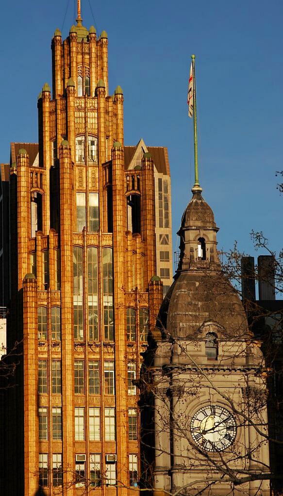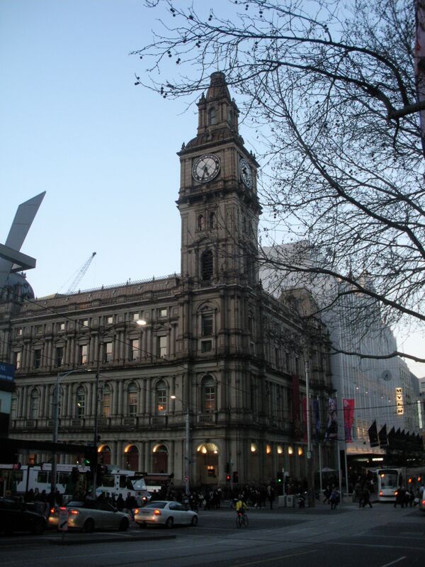 Каждый муниципалитет Мельбурна представлен собственным местом заседания местного правительства[56]. Центральное муниципальное здание города Мельбурна расположено на северо-восточном углу улиц Суонстон и Коллинз — это самая старая ратуша в столичном районе Мельбурна, построенная в 1887 году в стиле Второй Империи, знаковым местным архитектором Джозефом Ридом и Барнсом. Здание увенчано башней принца Альфреда, названной в честь герцога. Башню украшают подаренные Совету сыном мэра Валланжем Конделлом часы, диаметром 2,44 м, которые были запущены 31 августа 1874 года. Они были созданы Смитом и сыновьями в Лондоне. Самая длинная из их медных стрелок достигает 1,19 м и весит 8,85 кг. В главном помещении ратуши установлен великолепный концертный орган, ныне состоящий из 147 рядов и 9 568 труб. Орган был первоначально построен Hill, Norman & Beard (Англия) в 1929 году, но недавно расширен и настроен американской компанией Schantz Organ Company.