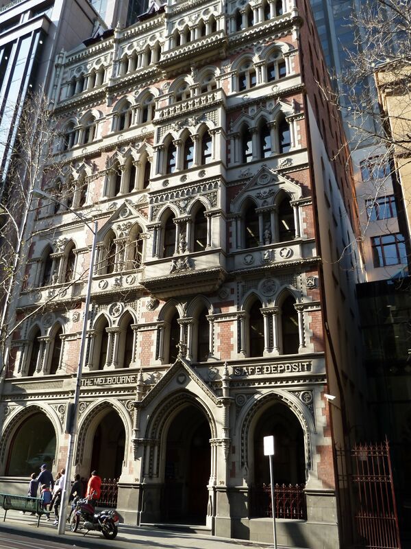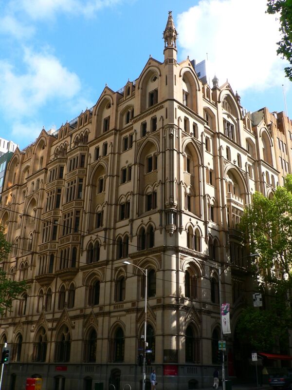 Один из двух оставшихся «небоскребов» 19-го века в Мельбурне — это бывшее здание Национальной ассоциации взаимопомощи расположенное на юго-западе на углу улиц Коллинз и Куин, девятиэтажное здание, построенное в 1892 году (расширенно в 1903 году компанией Best Overend & Partners). Здание было известно под различными названиями, например A.C. Goode House, с недавнего времени — Банк Новой Зеландии Австралии (BNZA). Это кирпичная конструкция с фасадом из фриза в стиле готической архитектуры[22], с остроконечными арками, увенчанная шпилями на крыше[23]. Дизайн был разработан фирмой из Аделаиды Wright, Reed and Beaver[22][24][25]. В «Наследии Виктории» отмечается, что здание в готическом стиле является прекрасным примером эстетической и архитектурной значимости. Внешний фасад содержит множество отличительных для стиля элементов, таких как роскошное моделирование, башня, парапеты и фронтоны, каменные кладки. Интерьер сочетаться с такими особенностями, как экзотические цоколи из серого мрамора, красные мраморные пилястры и колонны, а также лестницы из белого мрамора в фойе. Внутри оборудовано отделение банка с богато украшенным потолком[25]. Ряд других зданий, построенных в Мельбурне во время земельного бума, пережили прошлый век и сохранились до наших дней, такие как Королевский выставочный центр, построенный для Всемирной выставки 1880 года, Готический банк Уильяма Уорделла (1883), Отель Виндзор (1884), Old Stock Exchange Уильяма Питта в стиле венецианской готики (1888 г.) и Twentyman & Askew’s Stalbridge Chambers (1890 г.)[26][27].