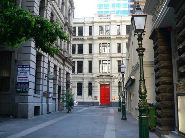 Многие переулки и пассажи Мельбурна стали всемирно известными. Мало того, что они могут похвастаться национальным и культурным значением в Австралии, но без их многообразия теперь невозможно представить и сам Мельбурн. Обилие переулков в центре Мельбурна отражает градостроительный план Мельбурна — сеть Ходдла, созданный в угоду эксплуатации повозок с лошадьми[58]. В некоторых частях города, особенно в районе Little Lon, они были связаны с трущобами эпохи золотой лихорадки. Известные переулки включают Centre Place и Degraves Street. Многочисленные торговые ряды Мельбурна достигли пика популярности в конце викторианской эпохи и в межвоенные годы. К ним, в частности, относятся Block Place и Royal Arcade. Некоторые известные пассажи были разрушены, как Coles Book arcade и Queens Walk arcade. Кафедральный Пассаж, в Nicholas Building (1927), был построен в стиле ар-деко и отражал архитектуру Мельбурна 1920-х годов со стеклянными сводами, витражами, арками и витринами с деревянными панелями, украшенными разнообразными деталями.
