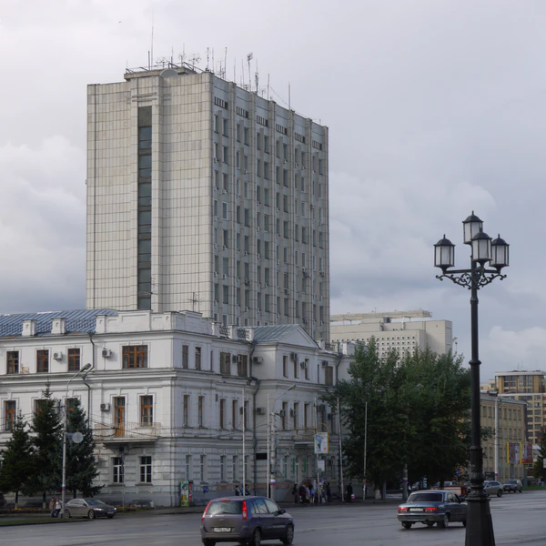 Старейший омский купец Георгий Васильевич Терехов в 1905 года утвердил проект «каменного здания для торгового помещения и гостиницы с нумерами и рестораном в городе Омске на углу Любинского и Санниковского проспектов», выполненный И. Г. Хвориновым. Здание, в подвале и на первом этаже которого находились магазины, в том числе самого Терехова, Н. Н. Машинского и других, а второй и третий этаж занимала гостиница «Россия», мастерски вписано в существующую градостроительную среду и отличается насыщенным декором фасадов с полуколоннами, 8-колонными портиками входов, поддерживающих балконы с парапетами из балясин или фигурными металлическими решётками. Здание было построено всего за год и сдано в 1906 году. В 1900-х годах Хворинов также спроектировал выразительный эклектичный особняк для Капитона Батюшкина, в 1918—1919 годах ставший резиденцией для А. В. Колчака[12][14].
