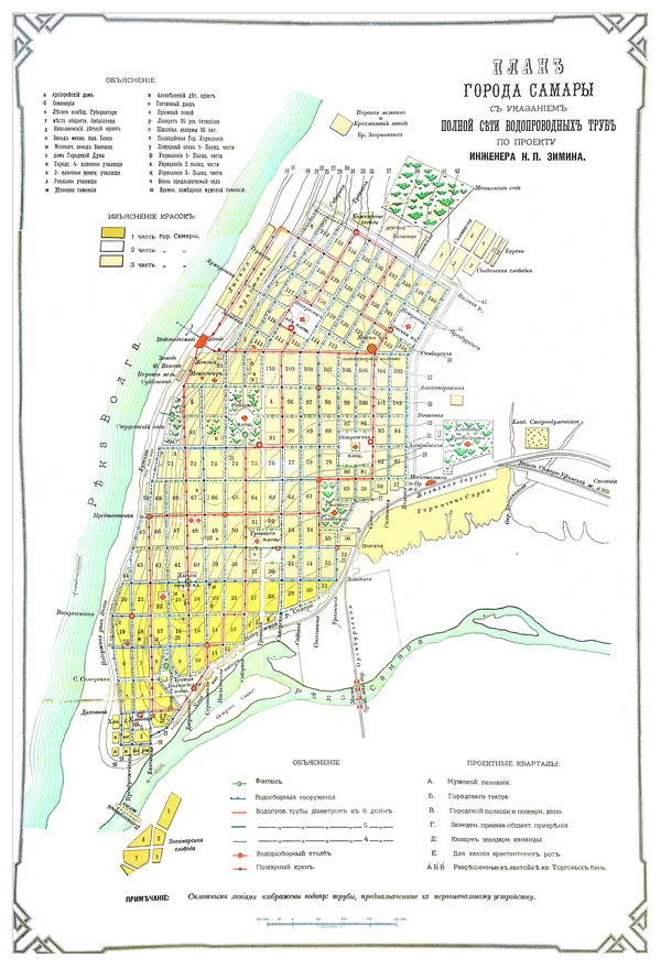 В 1763 году императрица Екатерина II подписала приказ «О сделании всем городам, их строению и улицам специальных планов по каждой губернии особо». В 70-х годах была развёрнута обширная деятельность «Комиссии о каменном строений Санкт-Петербурга и Москвы» по переустройству провинциальных городов. Тогда же началась разработка первого генерального плана Самары. В 1764 году поселение сменило административный статус, став слободой. В 1780 году вновь получило статус уездного города. В 1765 и 1772 годах сильно пострадало от пожаров. Несмотря на эти препятствия, в 1782 году Самара получила первый генеральный план с прямоугольной сеткой улиц[1].