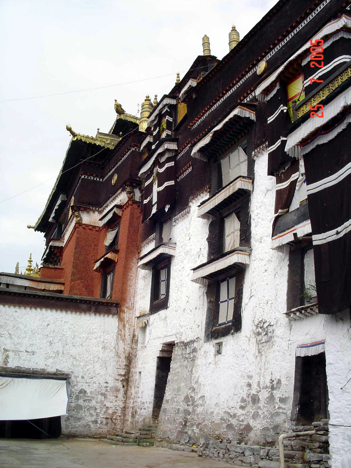 Традиционная тибетская архитектура жилых домов отличается накренёнными во внутреннюю сторону стенами и плоскими крышами. Дома красятся в белый цвет и окаймляются по периметру тёмной краской.