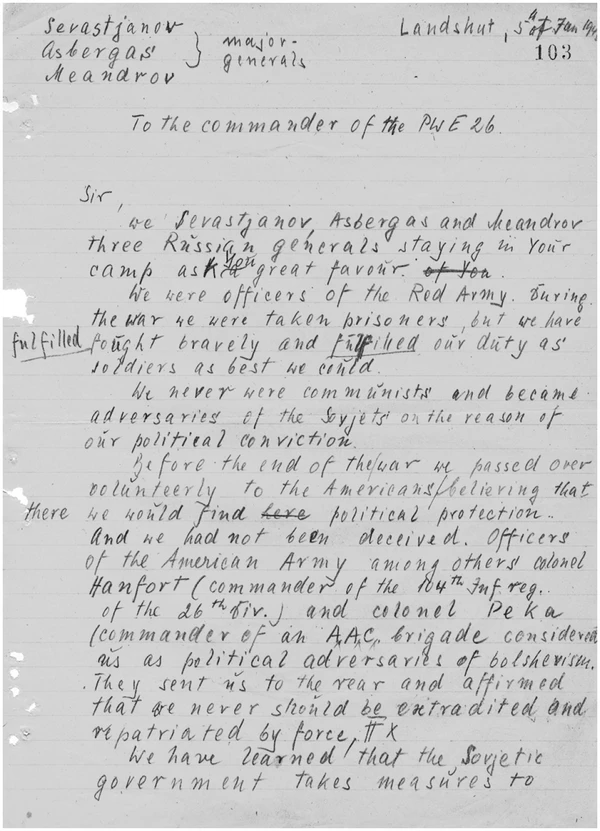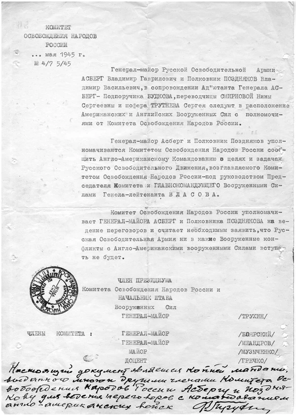 Условия перехода частей ВС КОНР на положение военнопленных 3-й американской армии, поставленные командиром 11-й танковой дивизии генерал-майором Дегером[56]: