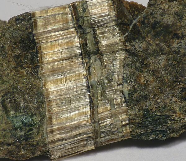- Хризотил-асбест (белый асбест) — минерал группы серпентина, химическая формула 3MgO•2SiO2•2H2O — гидросиликат магния, структурно относится к слоистым силикатам. Из-за несоразмерности тетраэдрического и октаэдрического слоев в структуре серпентина возникают напряжения, которые компенсируются за счет изгиба Т-О пакетов, что обычно приводит к их «гофрировке», однако в случае хризотила направленность изгиба сохраняется и такие слои закручиваются в трубочки с внешним диаметром около 200 ангстрем (20 нм). Хризотил-асбест стоек к щелочным средам, разлагается в кислотах с образованием аморфного кремнезёма. Элементарные кристаллы хризотила — тончайшие трубочки-фибриллы диаметром в сотые доли микрон. Практически хризотил разделяется на пучки волокон диаметром 10…100 мкм, прочность которых на разрыв составляет 600…800 МПа [1], что сравнимо с лучшими марками стали. Данный вид асбеста распространен в России.