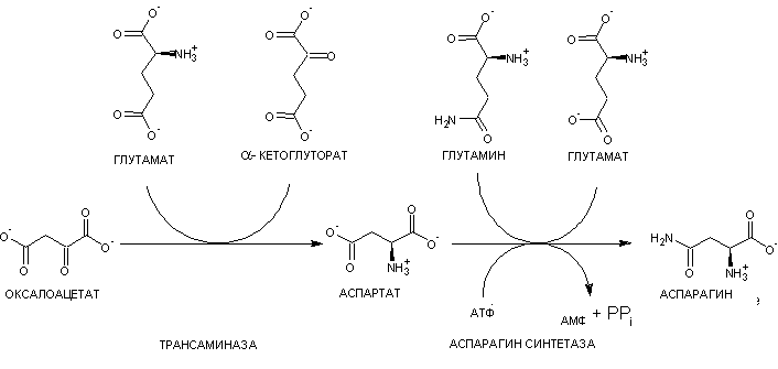 Прекурсором аспарагина является оксалоацетат. Оксалоацетат конвертируется в аспартат энзимом трансаминазой, который переносит аминогруппу с глутамата на оксалоацетат, в результате чего образуются α-кетоглутарат и аспартат. А реакцию образования аспарагина, АМФ, глутамата и пирофосфата из аспартата, глутамина и АТФ катализирует аспарагинсинтетаза. В этой реакции АТФ активирует аспартат, образуя формил-β-аспартил-АМФ, а глутамин даёт аминогруппу, которая реагирует с β-аспартил-АМФ, образуя аспарагин и свободную АМФ.