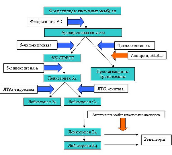 Лейкотриены синтезируются из арахидоновой кислоты, которая высвобождается из мембран клеток воспаления при их активации. Она представляет собой полиненасыщенную жирную кислоту. Её метаболизм представляет собой каскад ферментативных реакций: