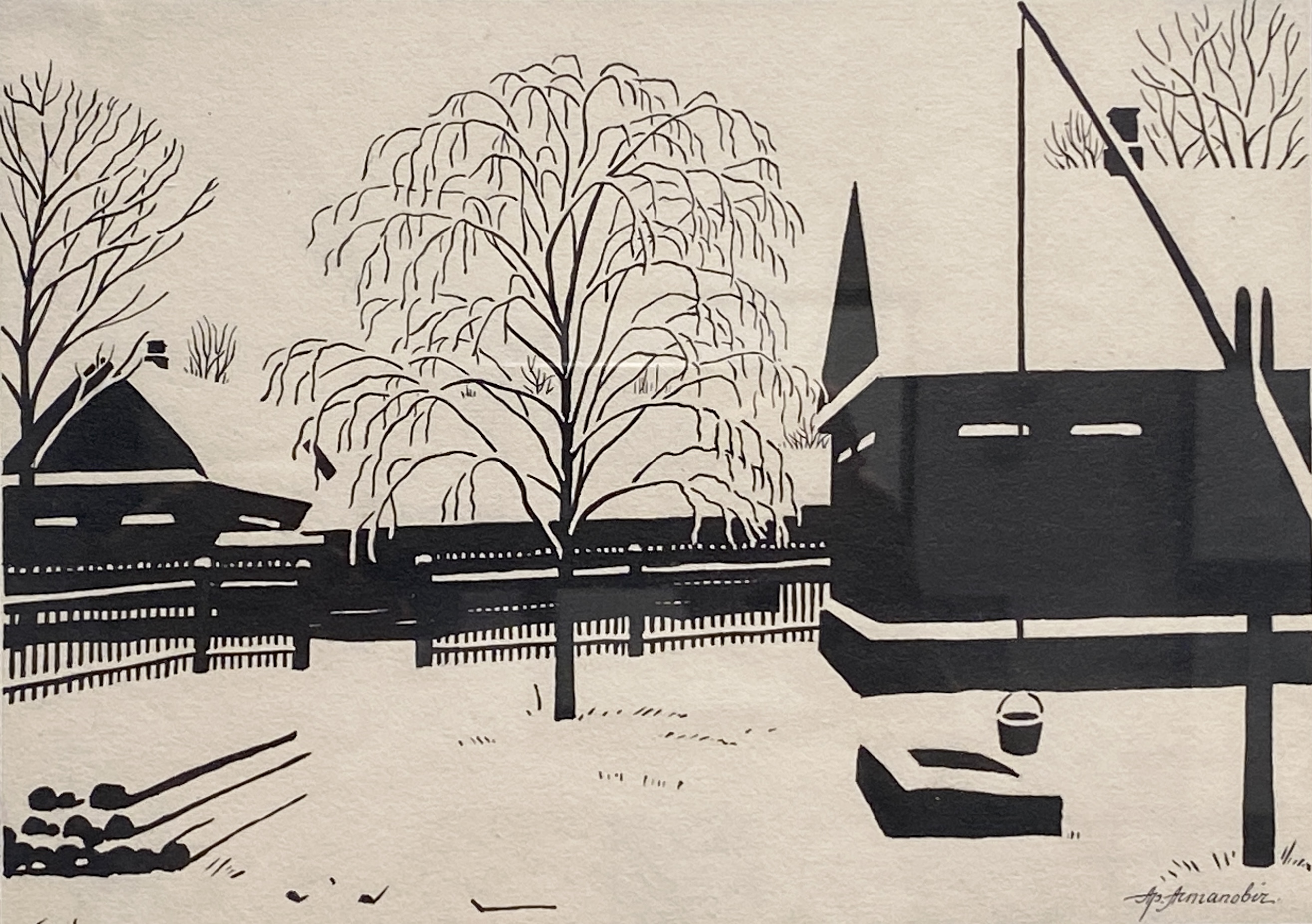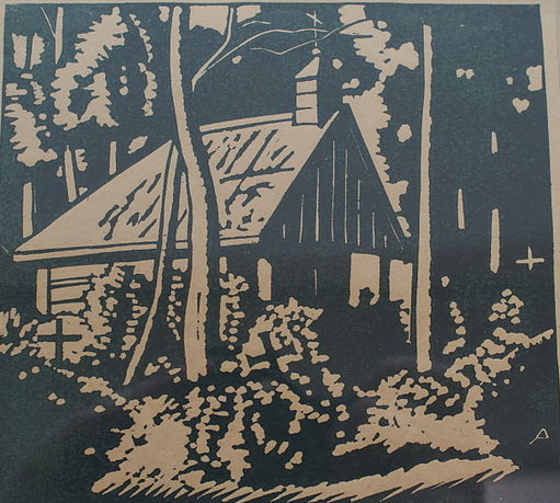Излюбленная техника — черная акварель в соединении с живописной штриховкой черной тушью, а также техника линогравюры